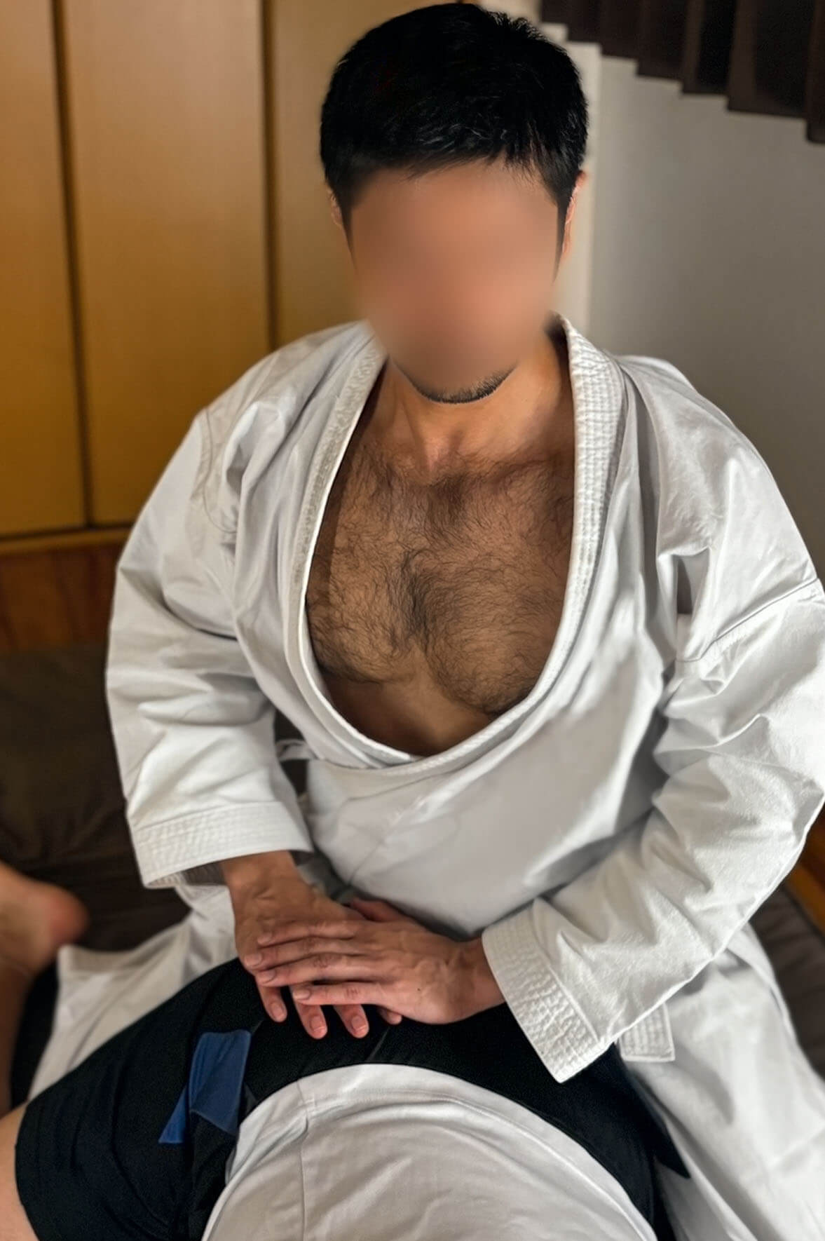 彫りの深い沖縄フェイスで、写真のとおり空手着が似合う、毛深くて男らしいがっちりとした体格です!